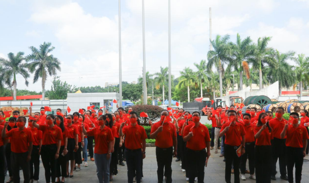盛夏七月,热情似火!头号玩家公司已是党旗飘扬,处处洋溢着喜庆祥和的气氛。当日上午,身穿“中国红”T恤的党员等参会人员有序入场,列队数字“100”庆祝图案,表达对中国共产党的无限热爱。随着主持人一声令下,伴随着激昂雄壮的国歌声,护旗手奋力将鲜艳的五星红旗抛向天空,国旗迎着清晨第一缕阳光冉冉升起,全体人员庄重注视国旗,高唱国歌,脸上写满了骄傲与自豪。